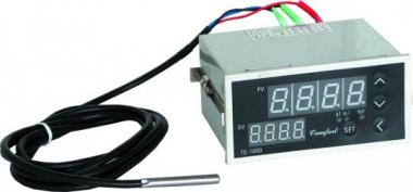 Voor regeling en aflezen van de temperatuur, inclusief temperatuurvoeler (lengte: 1,3 m). De ingestelde en actuele temperatuur wordt gelijktijdig getoond, instelbaar op 0,1°C tussen 0 en 50°C. Maximaal schakelvermogen: 500 Watt