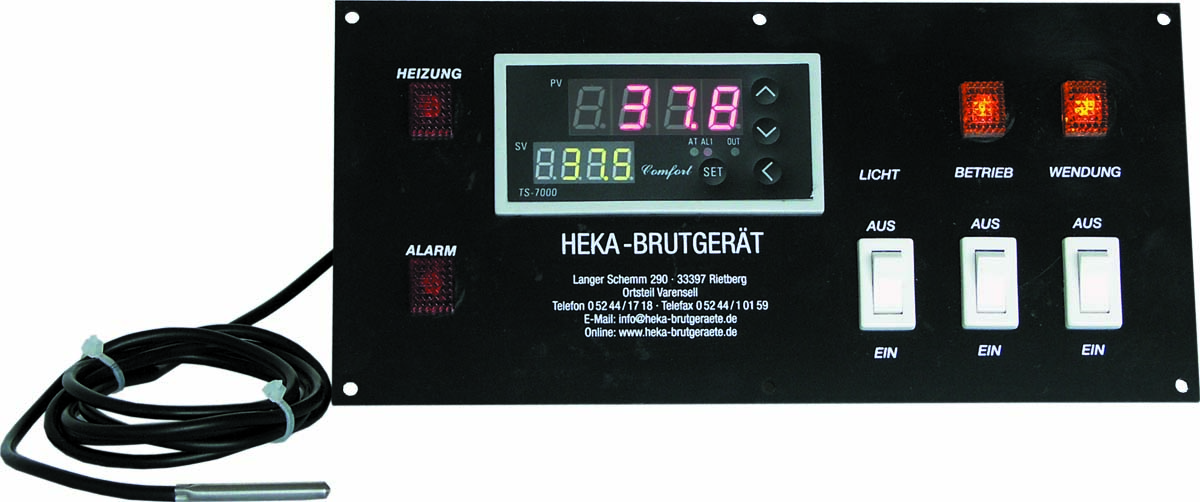 met de complete voorplaat (artikel 95101, foto # 2, zoals in bij de broedmachines van de serie Standard) incl. tuimelschakelaar, indicatielampjes en zwart paneel.
